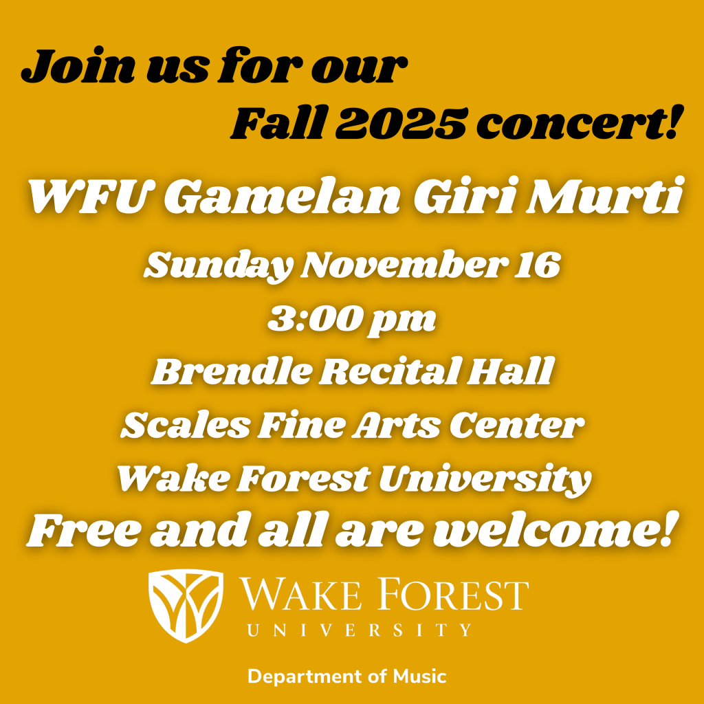 Gamelan Giri Murti, or Gamelan of the Enchanted Forest, is the premier ensemble dedicated to Balinese music, dance, and culture. The ensemble meets each Friday from 2:00-3:15 in room M305 in Scales Fine Arts Center at Wake Forest University’s Reynolda campus. We are open to students, staff, faculty and all interested community members! No experience needed. We’d love for you to join us!